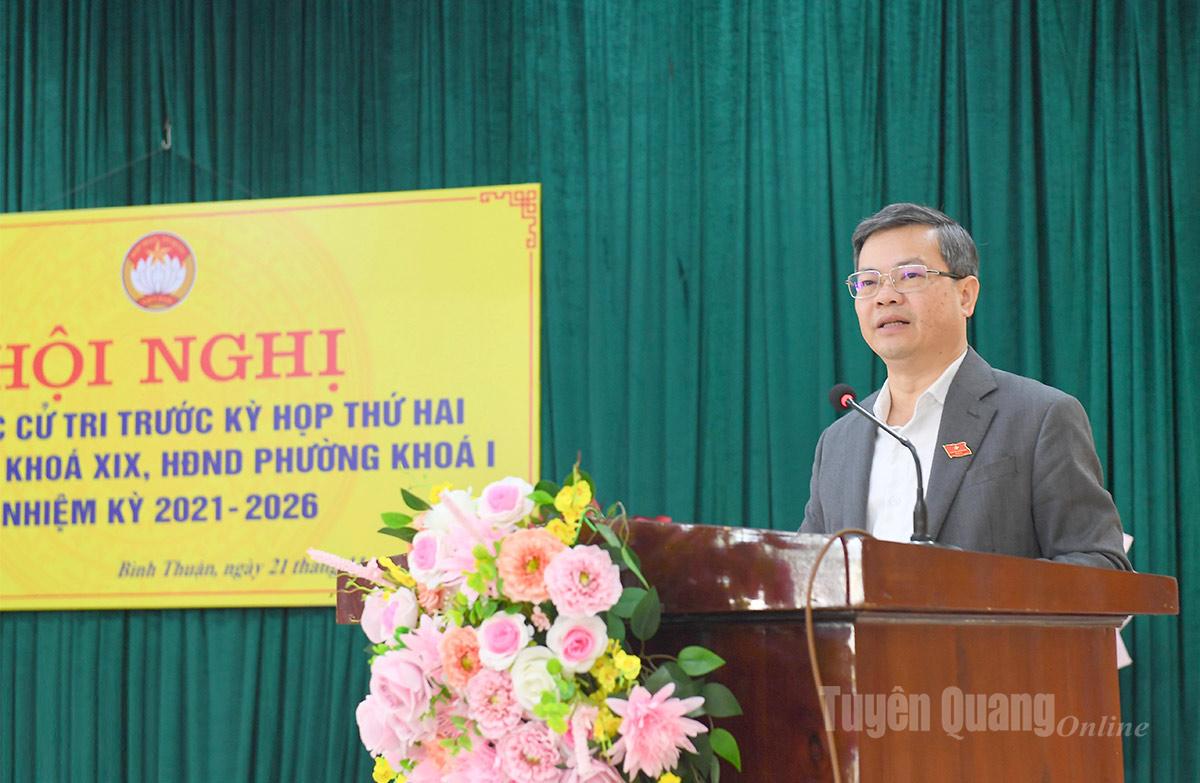 Phát biểu tại hội nghị, Chủ tịch HĐND tỉnh Nguyễn Văn Sơn đã ghi nhận, đánh giá cao sự nỗ lực của cấp ủy, chính quyền và toàn thể cử tri, Nhân dân trên địa bàn phường Bình Thuận ngay sau hợp nhất, sắp xếp đã đoàn kết, đồng lòng thực hiệu quả các mục tiêu đề ra, bộ máy mới của phường ngày càng hoạt động ổn định. Đồng chí đề nghị trong thời gian tới, Đảng ủy, HĐND, UBND phường tiếp tục quan tâm chỉ đạo triển khai thực hiện hiệu quả các mục tiêu về phát triển kinh tế - xã hội và bảo đảm quốc phòng, an ninh trên địa bàn, xây dựng phường có bước phát triển nhanh và bền vững.