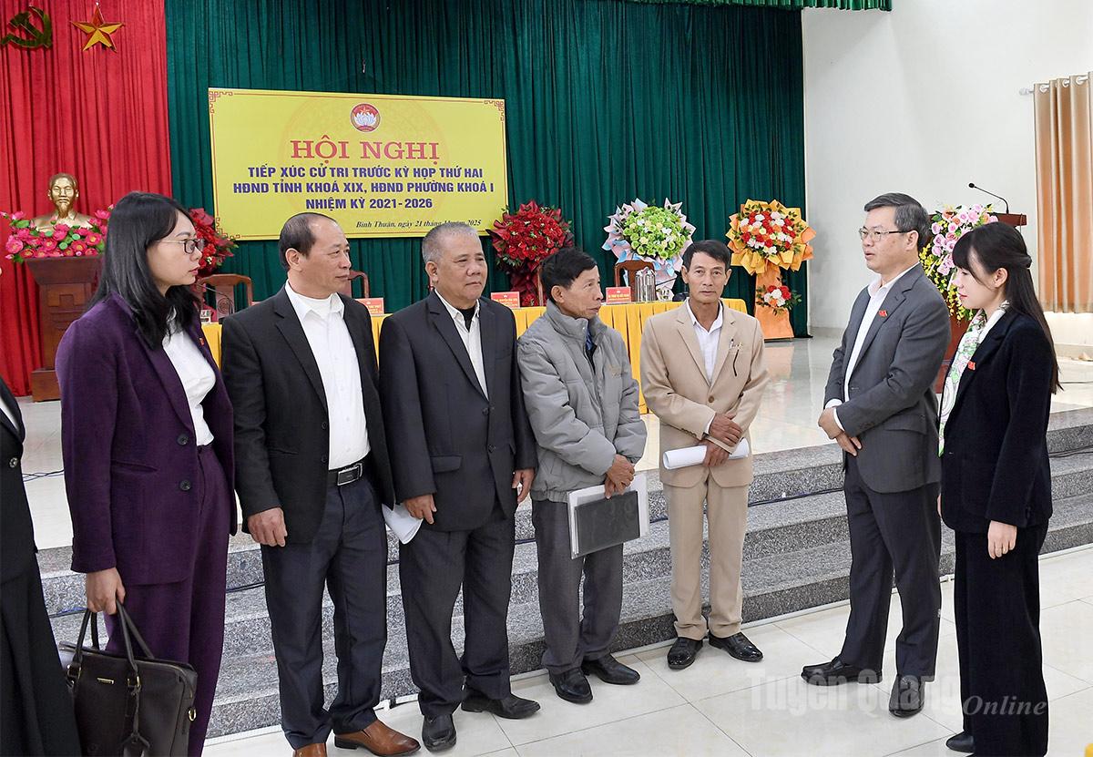 Chủ tịch HĐND tỉnh Nguyễn Văn Sơn trao đổi với cử tri phường Bình Thuận.