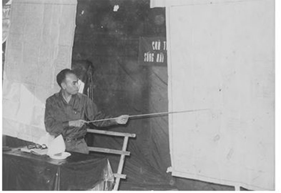 Tư lệnh Mặt trận Tây Nguyên Hoàng Minh Thảo phổ biến kế hoạch tác chiến ở Sở chỉ huy. Ảnh tư liệu