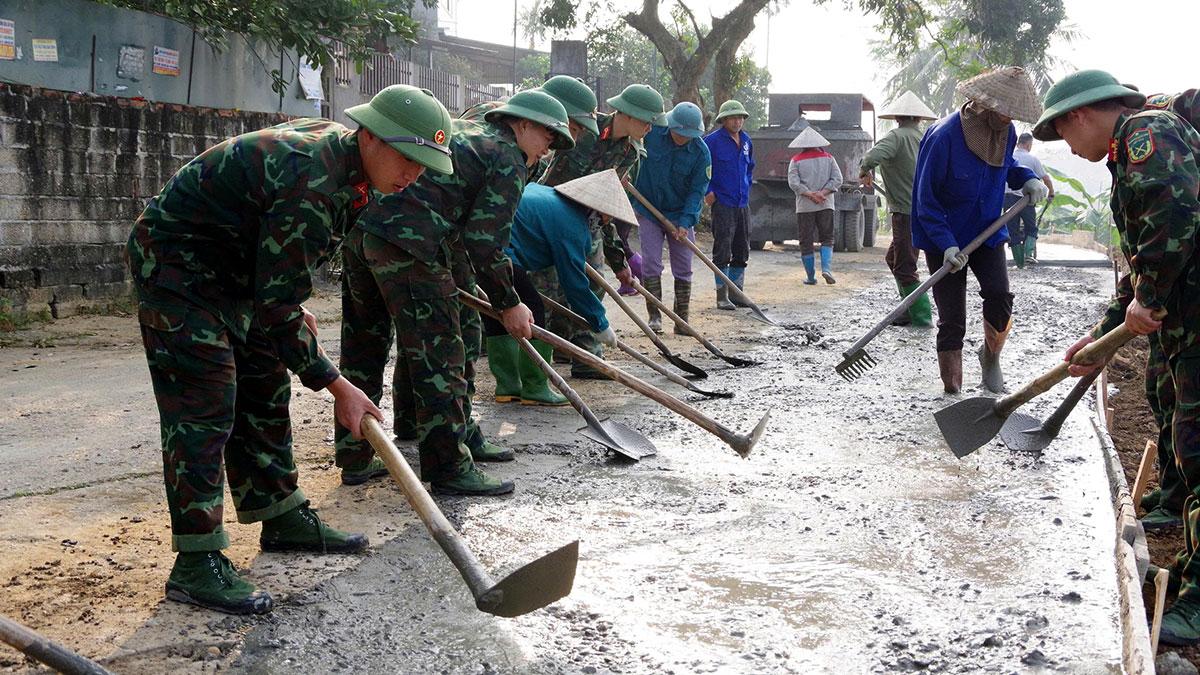 Lực lượng vũ trang tỉnh cùng nhân dân bê tông hóa đường giao thông nông thôn.