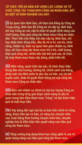 80 năm qua, dưới sự lãnh đạo của Đảng, Nhà nước, trực tiếp, sát sao là Đảng đoàn Bộ Công an, Bộ Công an, Ban Cán sự Đảng Bộ Nội vụ, Bộ Nội vụ, nay là Đảng ủy Công an Trung ương, Bộ Công an, cấp ủy, thủ trưởng Công an các đơn vị, địa phương, cơ quan tham mưu Công an các cấp đã phối hợp với các đơn vị nghiệp vụ và các cơ quan có liên quan chủ động tổ chức có hiệu quả công tác thông tin, phân tích, đánh giá, dự báo tình hình; thực hiện tốt chức năng tham mưu với Đảng, Nhà nước, cấp ủy, chính quyền và lãnh đạo Công an các cấp đề ra các chủ trương, đường lối, chính sách, pháp luật, nghị quyết, quyết định, mệnh lệnh, chương trình, đề án, kế hoạch công tác có ý nghĩa cơ bản, chiến lược, đồng thời tham mưu chỉ đạo giải quyết kịp thời các vấn đề mới phức tạp nổi lên về an ninh, trật tự.