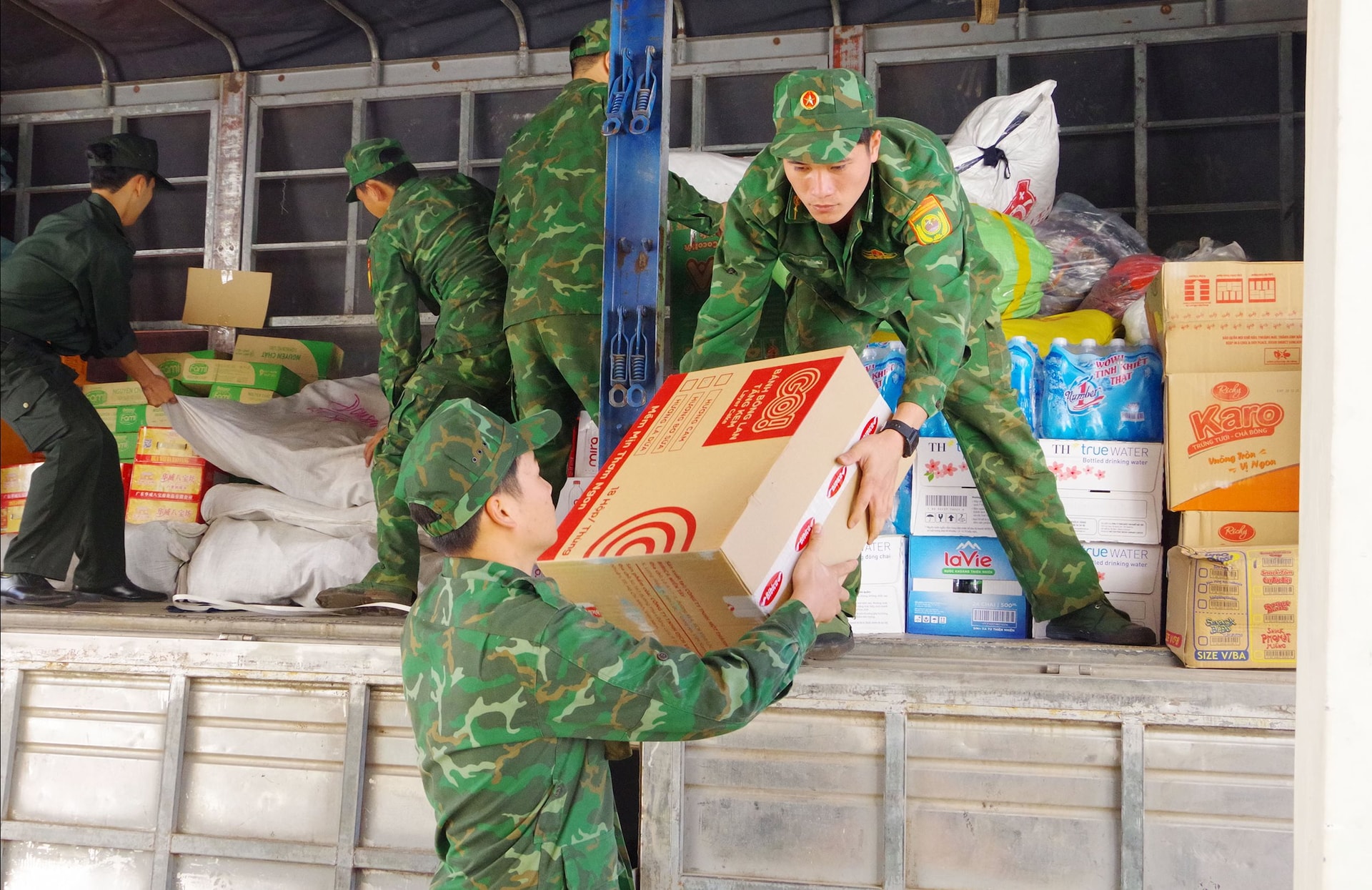 Cán bộ, chiến sĩ BĐBP tỉnh Lâm Đồng tham gia vận chuyển thực phẩm hỗ trợ Nhân dân vùng lũ