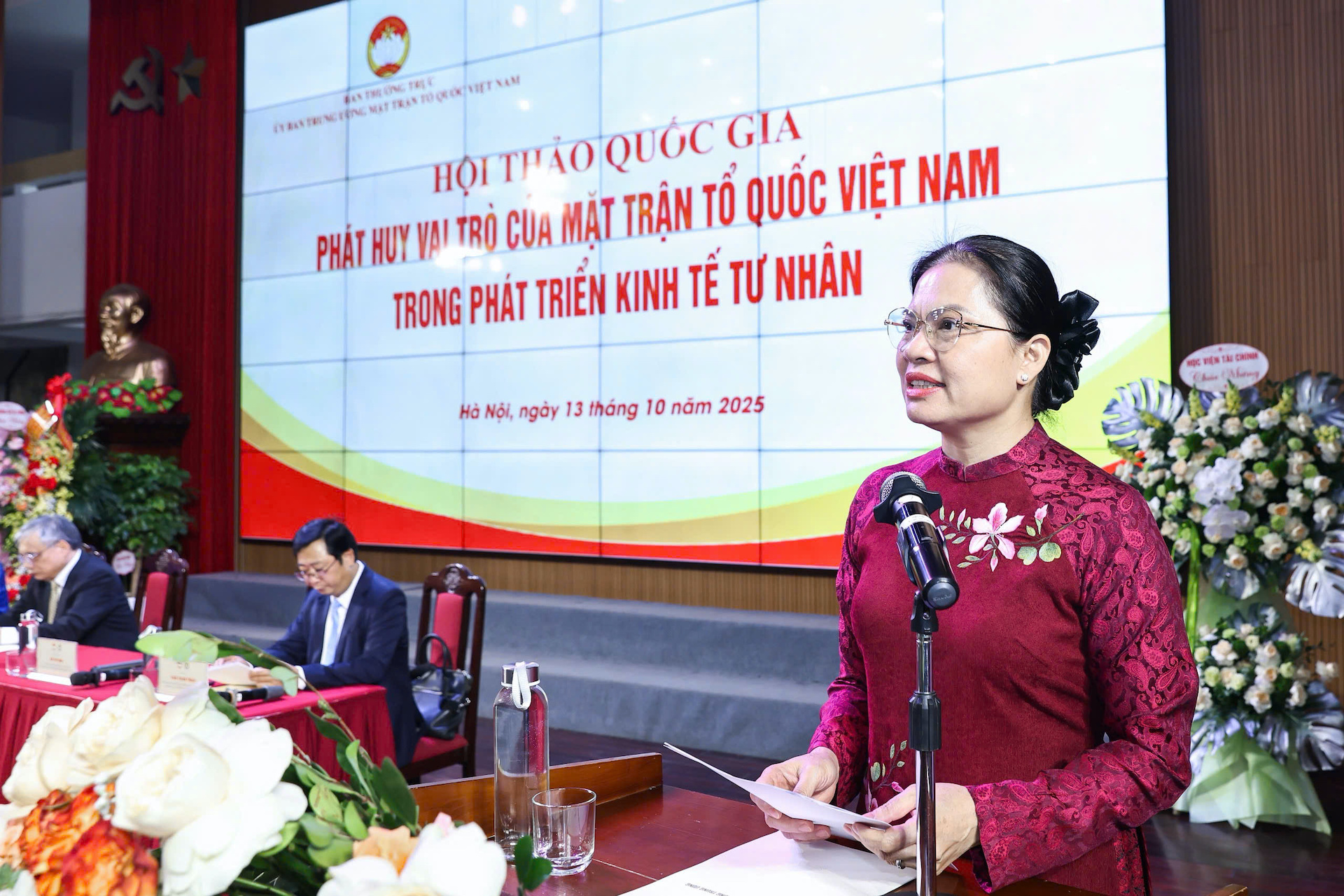 Phó chủ tịch Ủy ban Trung ương Mặt trận Tổ quốc Việt Nam Hà Thị Nga mong muốn hội thảo sẽ phát huy những đóng góp trí tuệ của các chuyên gia, nhà khoa học, nhà lãnh đạo quản lý, các doanh nhân, thông qua các hoạt động nghiên cứu khoa học nhằm tiếp tục củng cố, làm sâu sắc hơn cả về lý luận và thực tiễn; về vị trí, vai trò và các nhiệm vụ, giải pháp để phát huy sức mạnh đoàn kết của nhân dân, vai trò, trách nhiệm của Mặt trận Tổ quốc Việt Nam, các đoàn thể nhân dân trong phát triển kinh tế tư nhân.