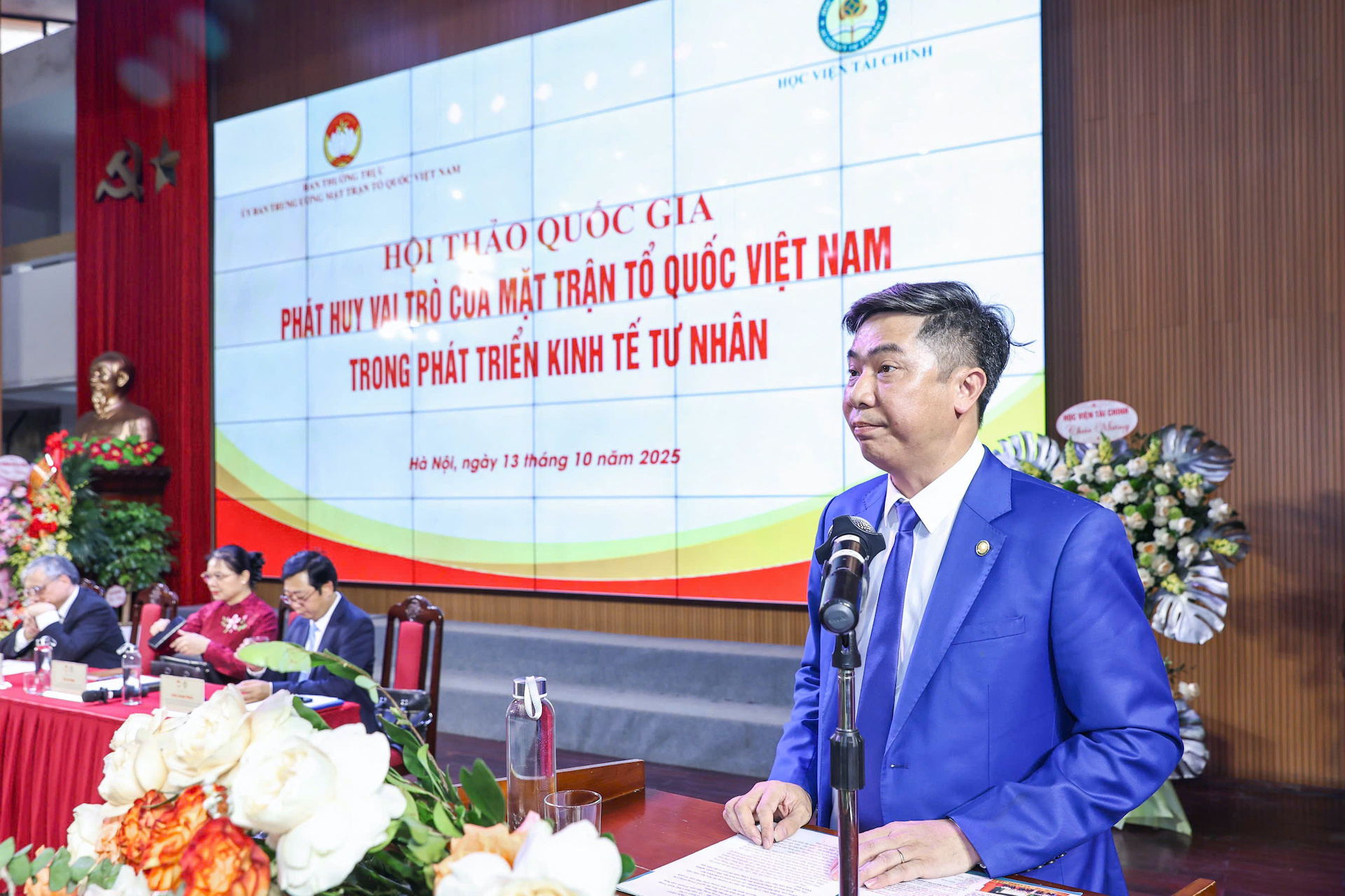 "Trải qua hơn 60 năm xây dựng và phát triển, Học viện Tài chính luôn khẳng định vị thế là cơ sở đào tạo, nghiên cứu hàng đầu về tài chính, kế toán, kinh tế công và quản lý, đồng thời là địa chỉ khoa học tin cậy của các cơ quan Đảng, Nhà nước, bộ, ngành trong hoạch định và phản biện chính sách. Hội thảo hôm nay là diễn đàn khoa học quan trọng, quy tụ các đồng chí lãnh đạo, nhà khoa học, chuyên gia, doanh nhân, giảng viên và sinh viên đến từ nhiều cơ quan, trường đại học, học viện, viện nghiên cứu và hiệp hội doanh nghiệp trong cả nước cùng trao đổi, chia sẻ kinh nghiệm, hiến kế những giải pháp thực tiễn, thiết thực nhằm phát huy vai trò của Mặt trận Tổ quốc Việt Nam trong thúc đẩy kinh tế tư nhân phát triển năng động, hiệu quả và bền vững", PGS, TS Nguyễn Đào Tùng khẳng định.