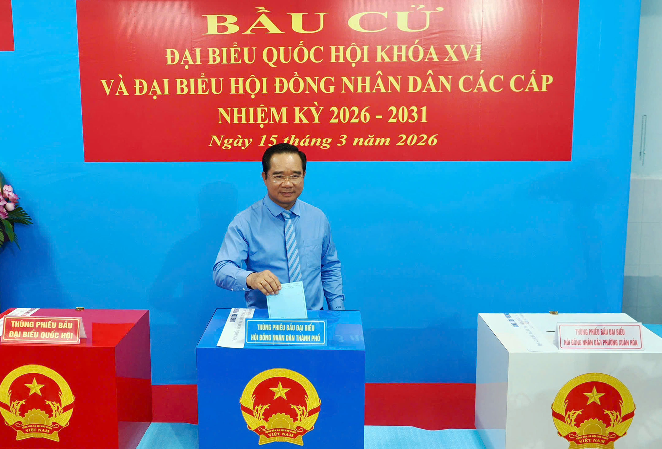 Tại khu vực bỏ phiếu số 3 (phường Vũng Tàu, TPHCM), Phó Chủ nhiệm Ủy ban Kiểm tra Trung ương Nguyễn Hồng Lĩnh, Phó Bí thư Thành ủy TPHCM Đặng Minh Thông và Phó Chủ tịch Thường trực HĐND TPHCM Nguyễn Văn Thọ cùng đông đảo cử tri dự lễ khai mạc, thực hiện quyền bầu cử.