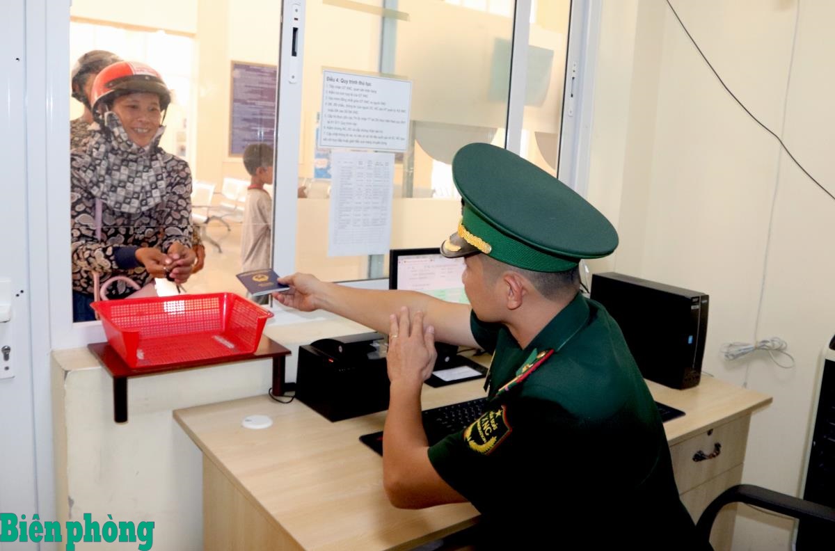 Cán bộ Trạm Kiểm soát Biên phòng cửa khẩu quốc tế Tịnh Biên, Đồn Biên phòng cửa khẩu quốc tế Tịnh Biên, Bộ đội Biên phòng tỉnh An Giang làm thủ tục xuất, nhập cảnh cho du khách. Ảnh: Chiến Khu