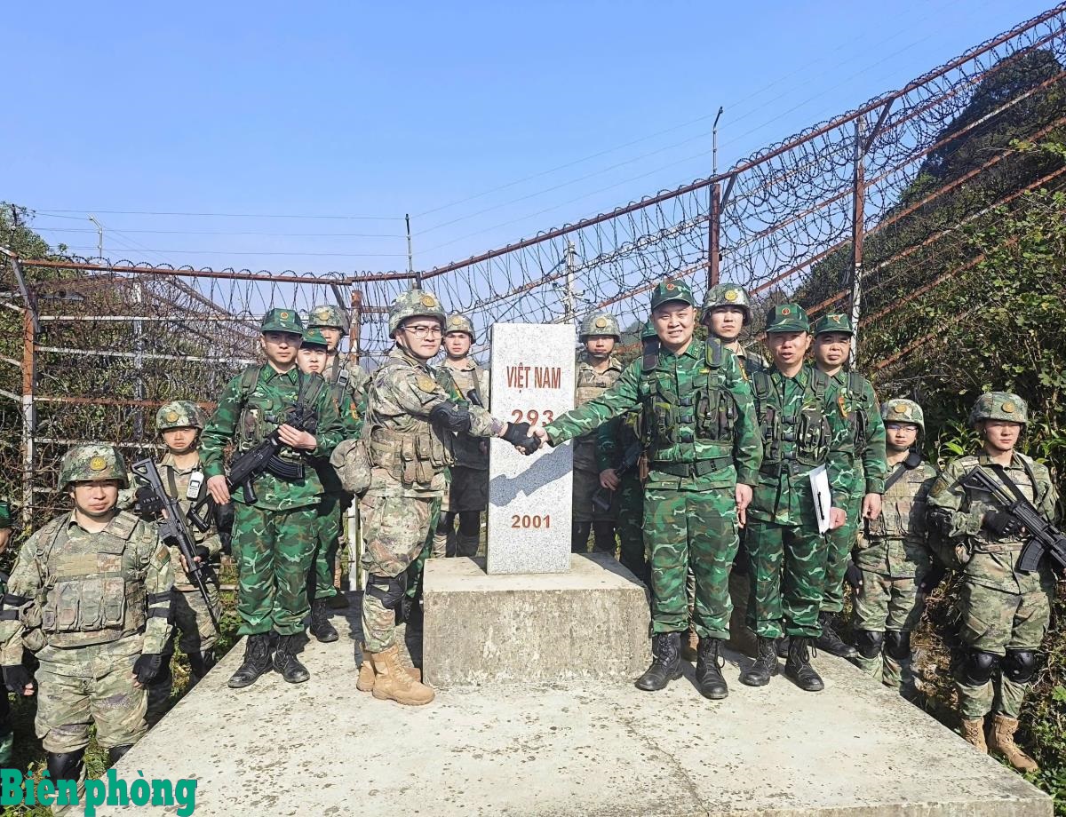 Đồn Biên phòng Tùng Vài, Bộ đội Biên phòng tỉnh Tuyên Quang và Trạm Hội ngộ hội đàm Biên phòng Ma Ly Pho (Trung Quốc) thực hiện nghi thức chào xã giao thể hiện tinh thần đoàn kết, hữu nghị tại cột mốc 293. Ảnh: Hoàng Chính