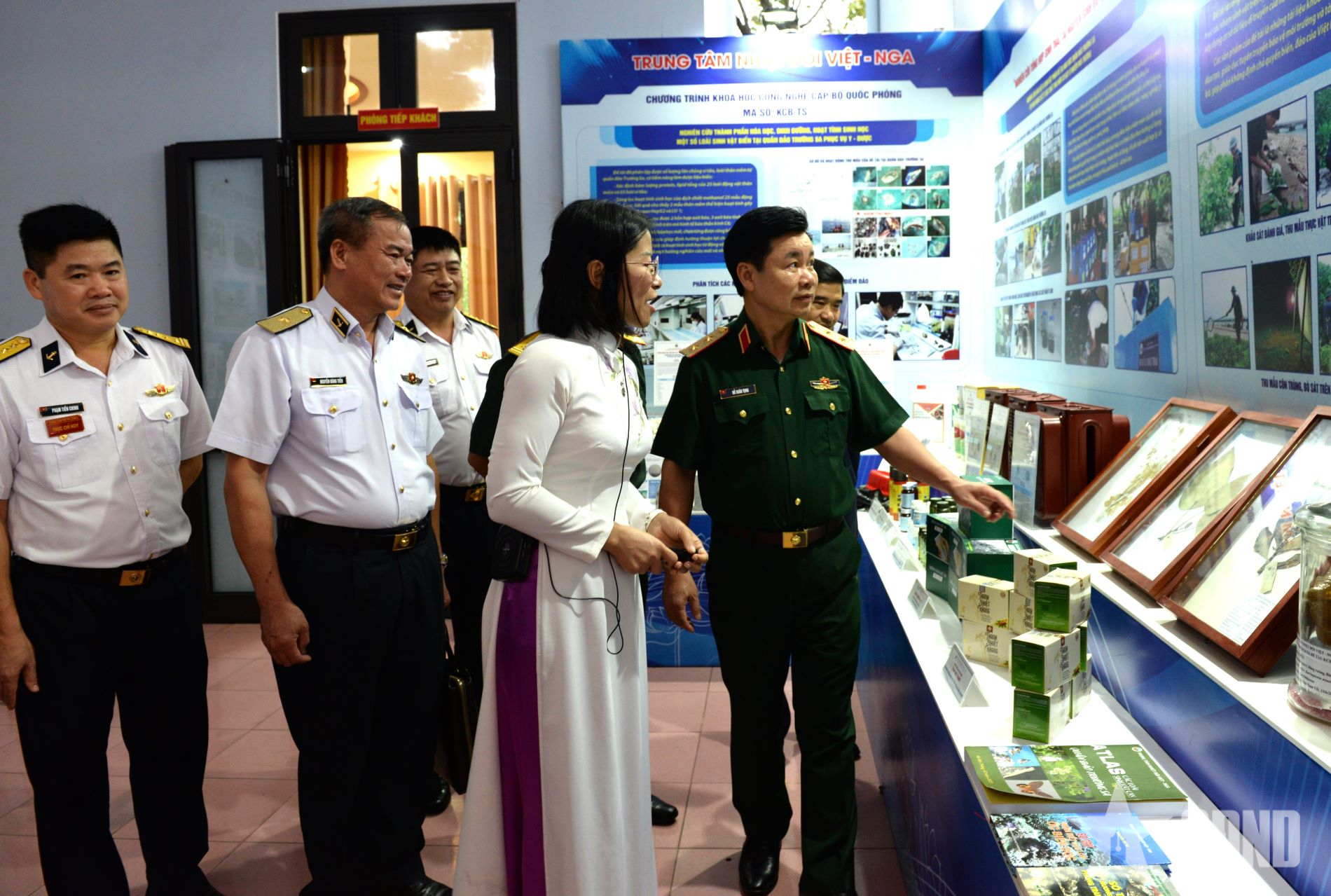 Trung tướng Đỗ Xuân Tụng và các đại biểu tham quan các sản phẩm, công trình khoa học của Trung tâm Nhiệt đới Việt - Nga trưng bày tại hội thảo.