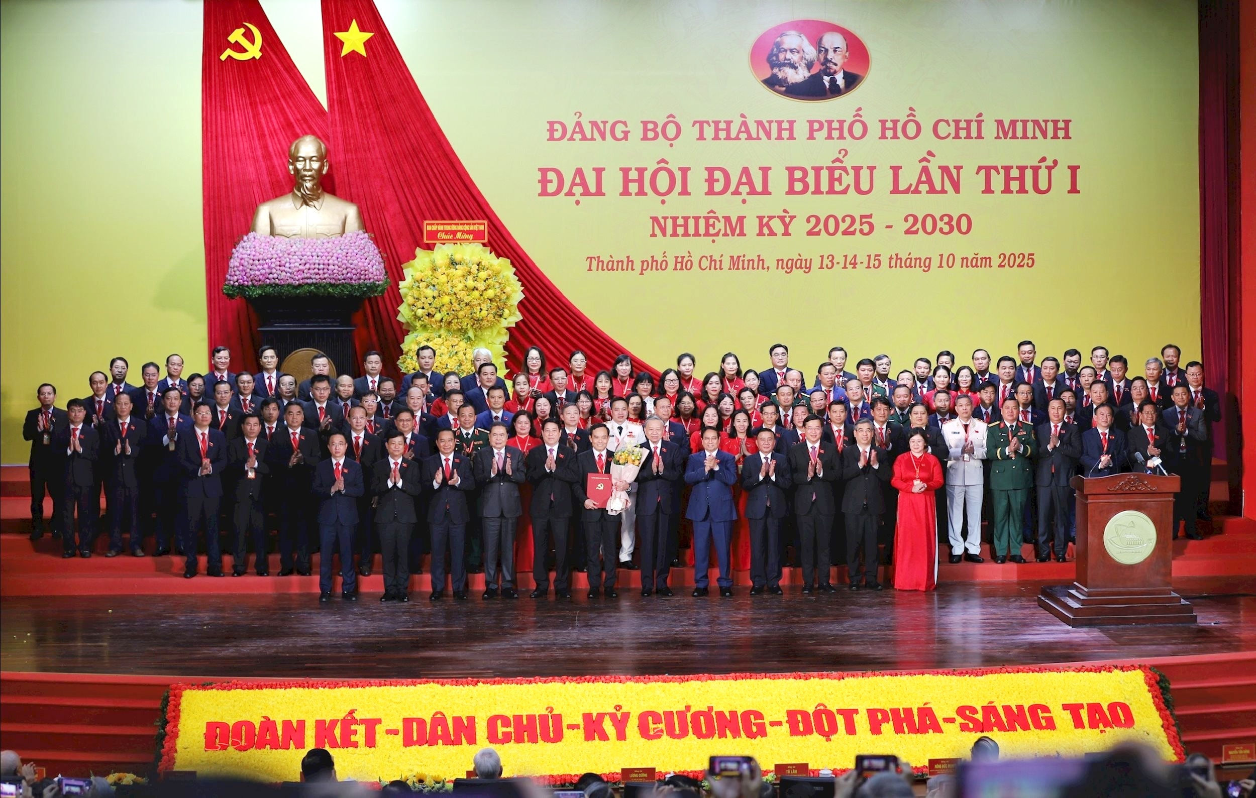 Tổng Bí thư Tô Lâm, Chủ tịch nước Lương Cường, Thủ tướng Chính phủ Phạm Minh Chính, Chủ tịch Quốc hội Trần Thanh Mẫn cùng các đại biểu và Ban Chấp hành Đảng bộ Thành phố Hồ Chí Minh Khóa I, nhiệm kỳ 2025 - 2030