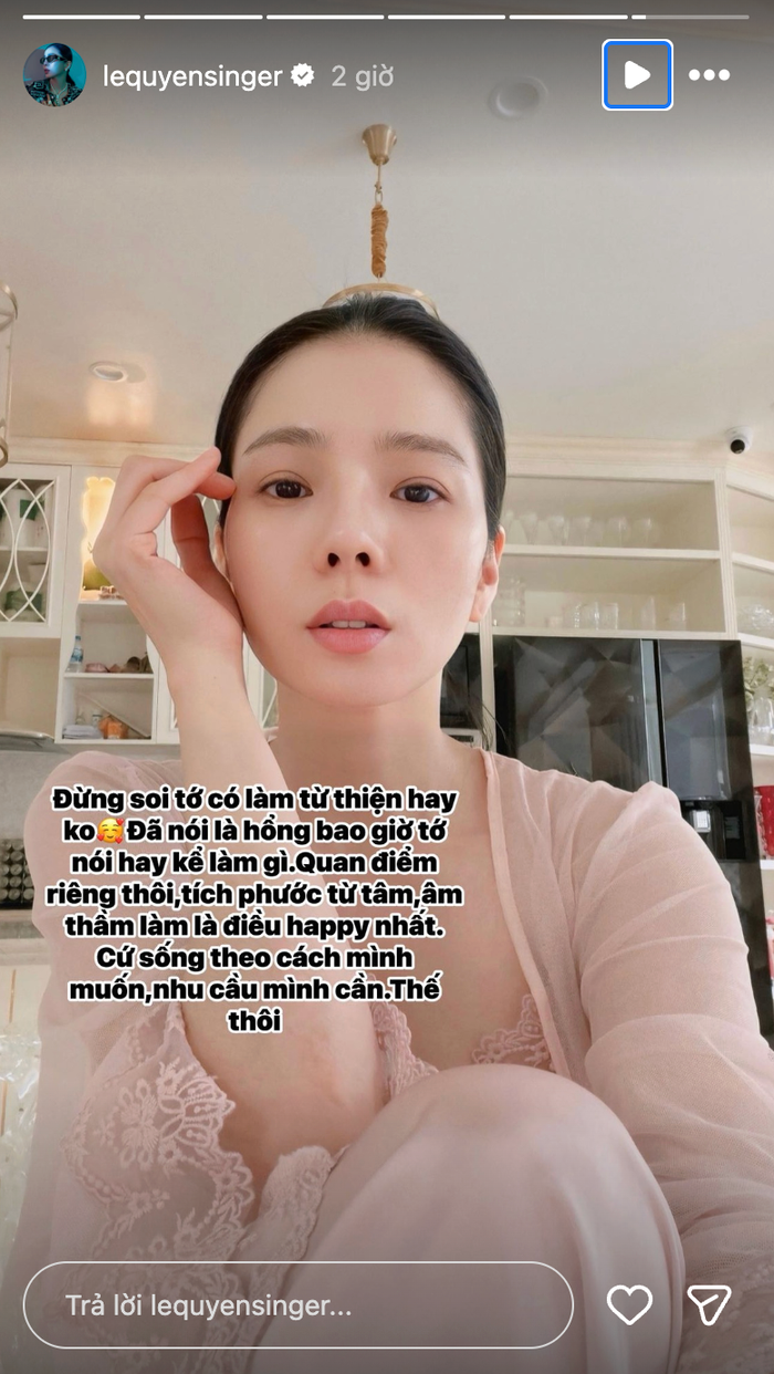 Trên trang cá nhân, Lệ Quyên khẳng định bản thân chưa bao giờ kể công hay công khai việc làm từ thiện. Cô nói rõ: “Quan điểm riêng thôi, tích phước từ tâm, âm thầm làm là điều hạnh phúc nhất. Cứ sống theo cách mình muốn, nhu cầu mình cần. Thế thôi”.