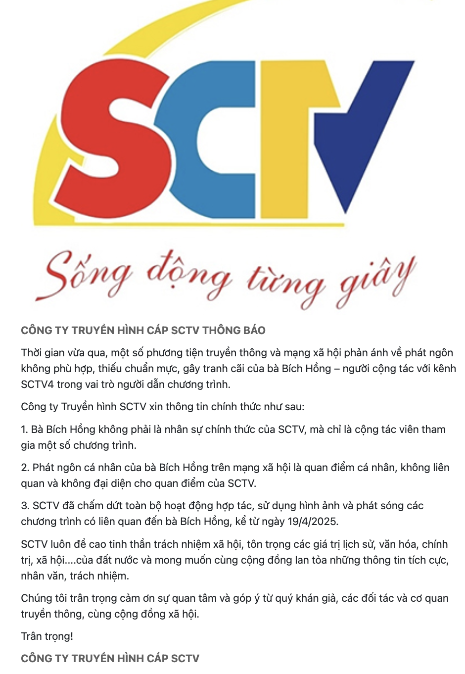 Đơn vị này cũng thông tin, SCTV đã chấm dứt toàn bộ hoạt động hợp tác, sử dụng hình ảnh và phát sóng các chương trình có liên quan đến bà Bích Hồng, kể từ ngày 19-4.