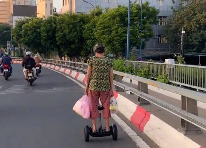 Hình ảnh người phụ nữ đi xe điện cân bằng trên cầu Khánh Hội