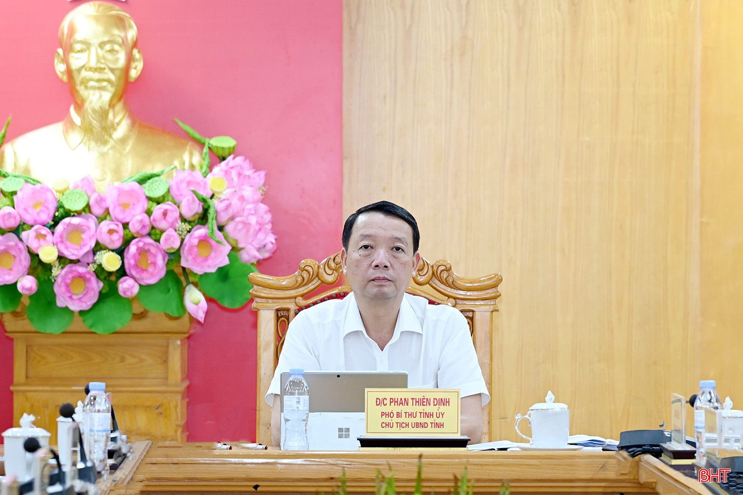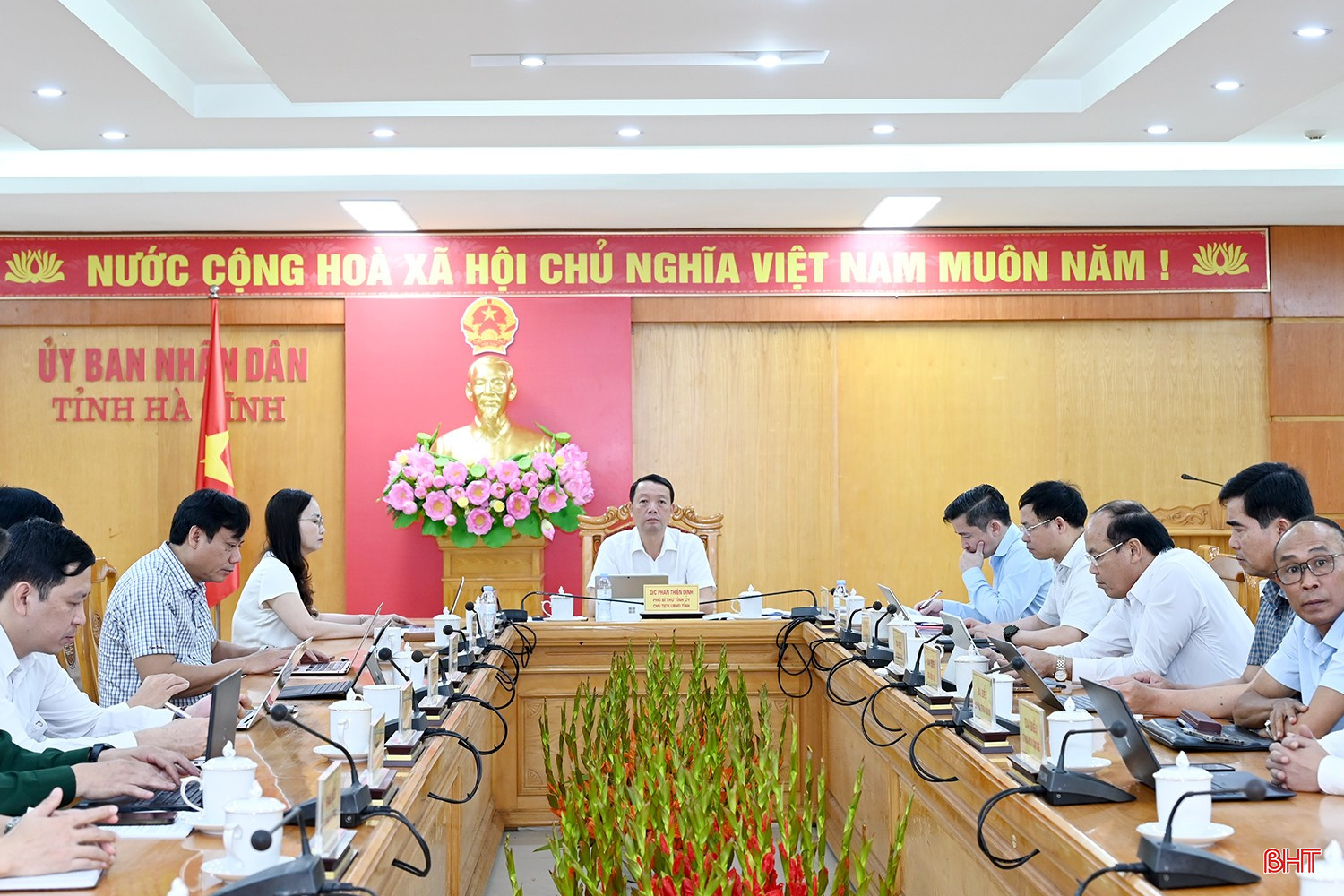Đồng chí Phan Thiên Định - Phó Bí thư Tỉnh ủy, Chủ tịch UBND tỉnh điều hành tại điểm cầu Hà Tĩnh. Cùng dự có đại diện lãnh đạo các ban, sở, ngành liên quan.