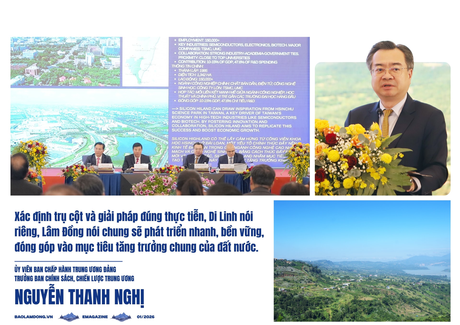 Theo Ủy viên Ban Chấp hành Trung ương Đảng, Trưởng Ban Chính sách, Chiến lược Trung ương Nguyễn Thanh Nghị, Di Linh đang hội tụ đầy đủ điều kiện, tiềm năng, thời cơ để trở thành hạt nhân tăng trưởng, trung tâm kết nối vùng và động lực phát triển mới cho Lâm Đồng.