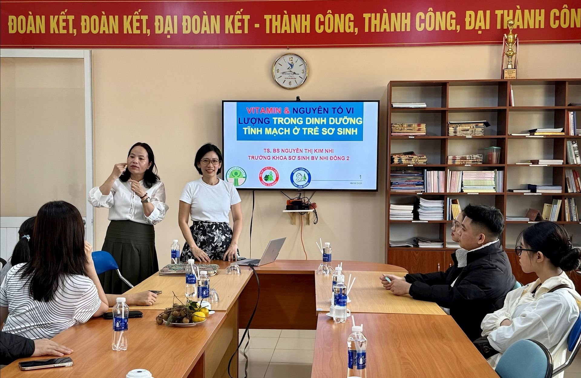 Tại buổi làm việc, đoàn công tác Bệnh viện Nhi Đồng 2 đã khảo sát thực tế tại các Khoa Nhi, Sơ sinh; các góc sơ sinh tại phòng sanh, phòng mổ và chia sẻ kinh nghiệm trong chăm sóc và điều trị nhi, sơ sinh cho các bác sĩ, điều dưỡng của các khoa. Đồng thời, cập nhật các kiến thức về sử dụng kháng sinh trong nhiễm khuẩn huyết sơ sinh; Vitamin và nguyên tố vi lượng trong dinh dưỡng tĩnh mạch ở trẻ sơ sinh; giải pháp phòng ngừa nhiễm khuẩn huyết liên quan đường truyền trung tâm.