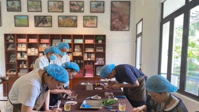 Du khách trải nghiệm làm sô-cô-la từ Ca cao tại Công ty cổ phần Binon Cacao, xã Châu Đức, Thành phố Hồ Chí Minh.