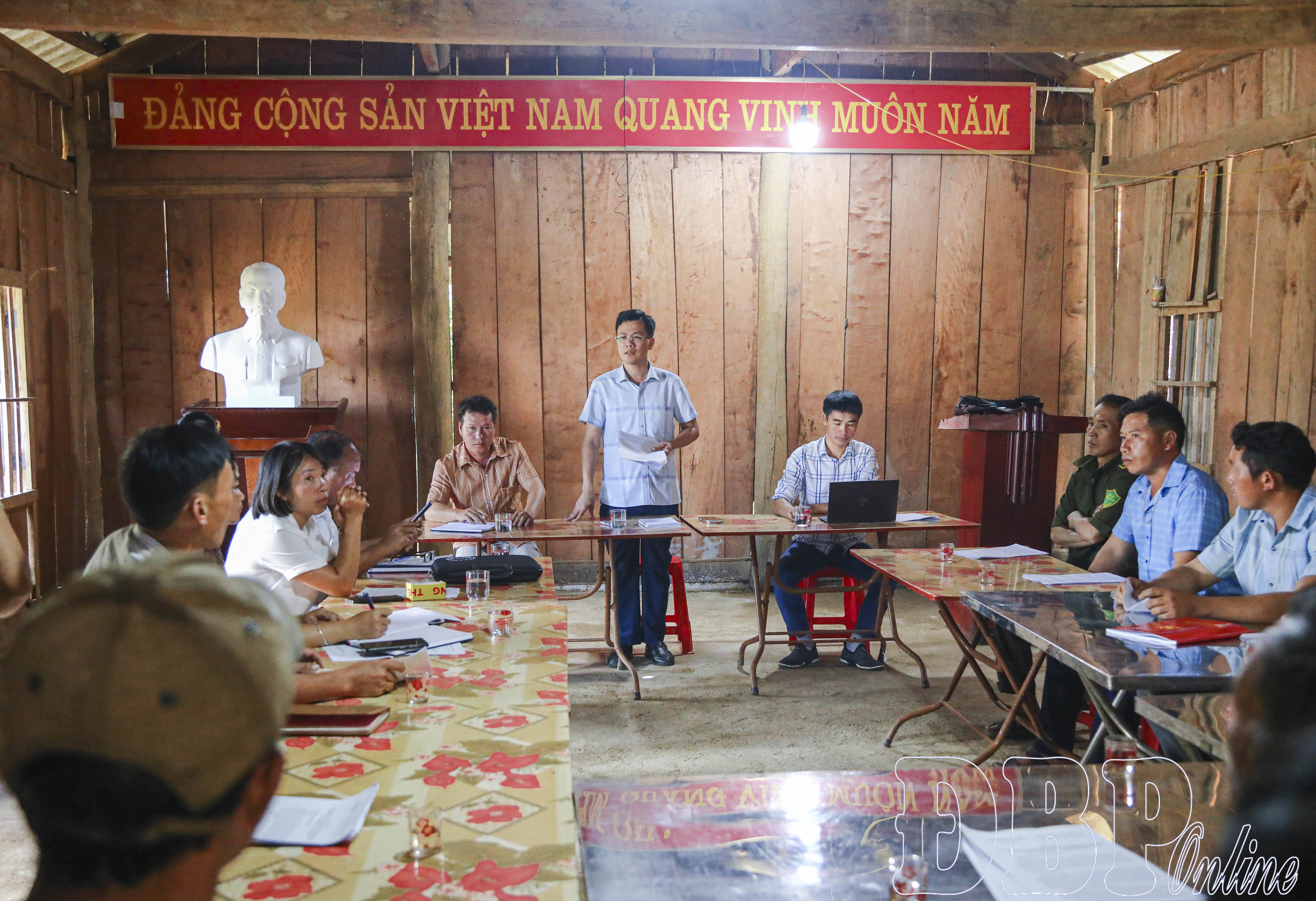 Lãnh đạo xã Tìa Dình gặp mặt, trao đổi với người dân bản Huổi Sông nhằm xây dựng mô hình trồng cà phê tập trung.