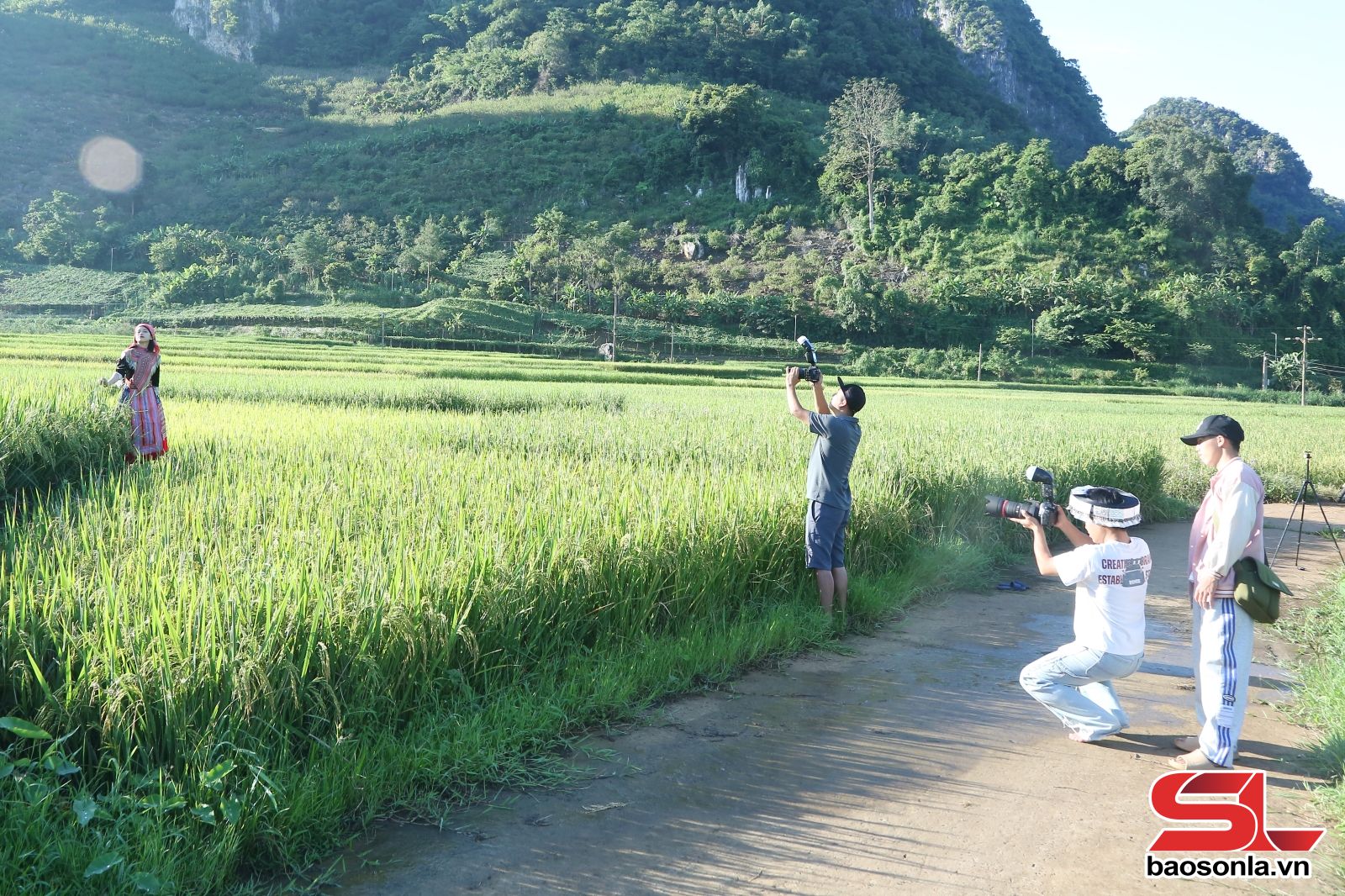 Du khách chụp ảnh tại đồng lúa chín bản Hùn, phường Chiềng Cơi.
