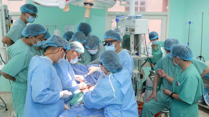 Thực hành ca phẫu thuật trực tiếp tại phòng mổ Trung tâm Tim mạch, BVTW Huế. Ảnh: T.Hiển