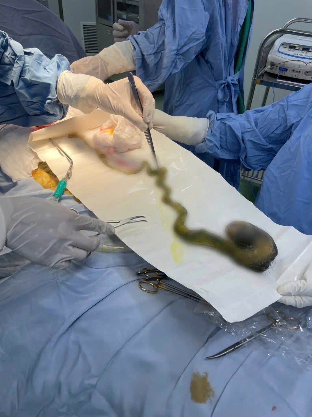 Sau khoảng hai giờ can thiệp, ê-kíp phẫu thuật đã lấy toàn bộ búi tóc ra khỏi dạ dày và ruột non của bệnh nhi.