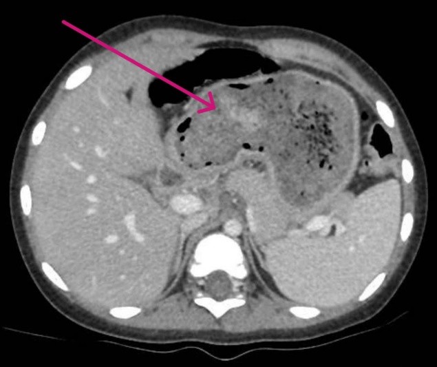 Qua thăm khám và chụp CT-scan, các bác sĩ phát hiện một búi tóc chiếm gần như toàn bộ dạ dày và kéo dài qua tá tràng xuống ruột non. Đây là biểu hiện điển hình của trichobezoar (búi tóc trong dạ dày) tiến triển thành hội chứng Rapunzel. Em A. được chỉ định phẫu thuật mở dạ dày để lấy búi tóc ra ngoài.