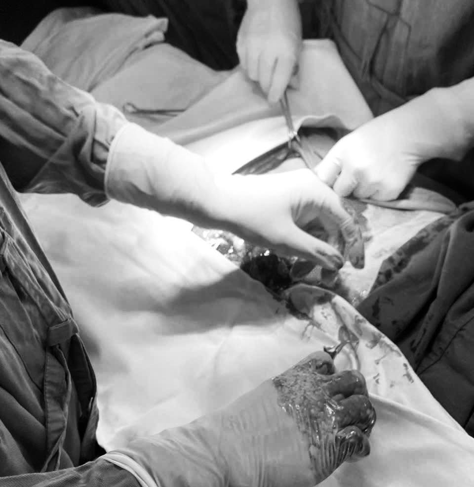 Bệnh nhân bị vết thương hở vùng bụng rộng, ruột non và ruột già lòi hoàn toàn ra ngoài ổ bụng, mất máu cấp, mạch nhanh, huyết áp tụt, da niêm mạc nhợt, SpO₂ chỉ còn 88%.