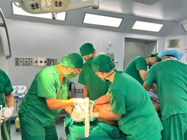 Ê-kíp bác sĩ do BSCKII Nguyễn Tiến Dũng – Phó giám đốc bệnh viện trực tiếp thực hiện ca phẫu thuật nắn trật, giải phóng chèn ép tủy, cố định và ghép xương cho nam bệnh nhân H.V.N.
