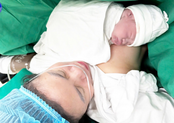 Em bé chào đời khỏe mạnh và được da kề da với mẹ.