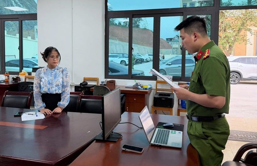 Cơ quan CSĐT Công an tỉnh Lào Cai tống đạt Quyết định khởi tố bị can đối với Nguyễn Thị Thanh Hiên. Ảnh: CALC