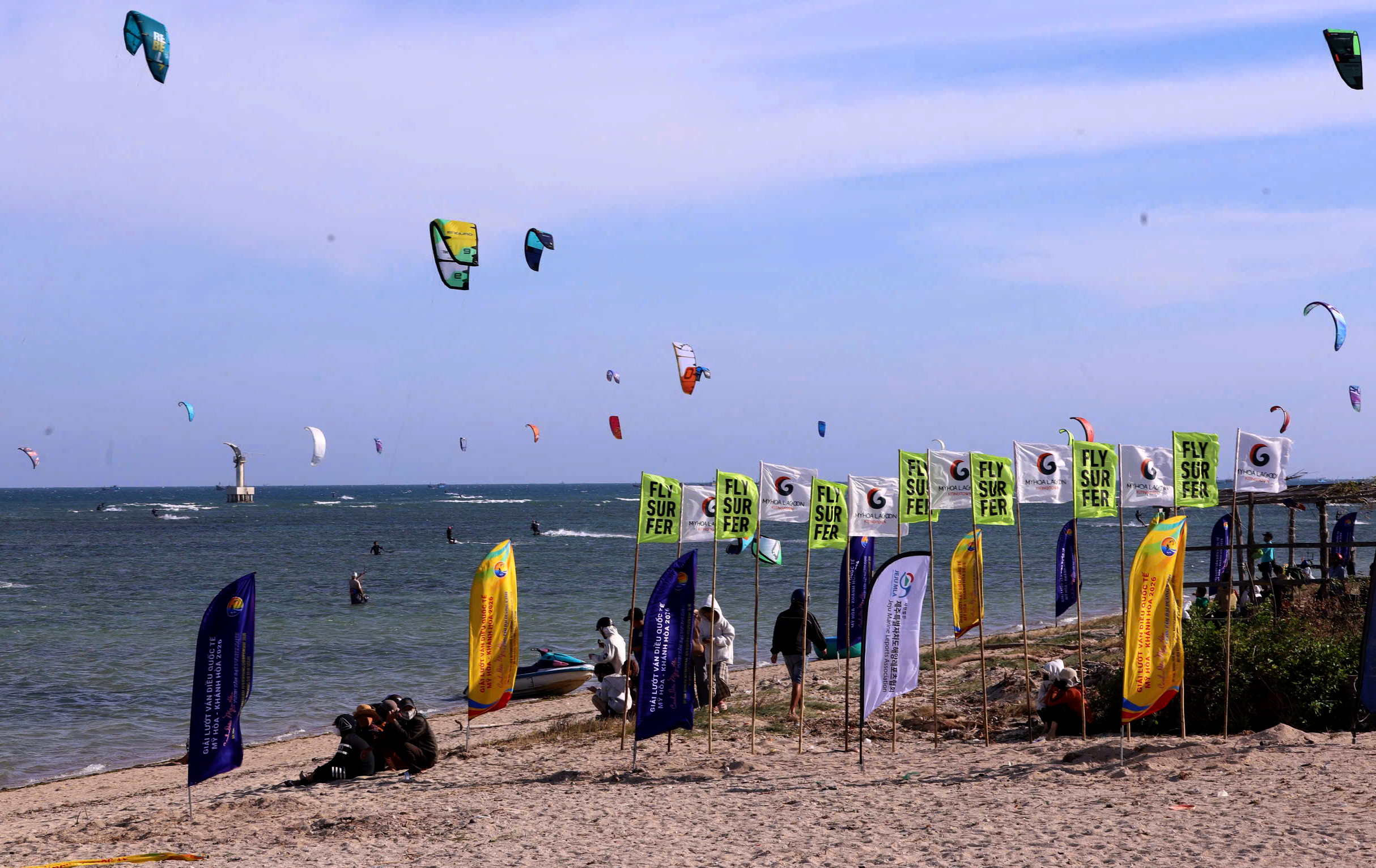 Du khách trải nghiệm lướt ván diều ở biển Mỹ Hòa. Ảnh: NÚI XANH