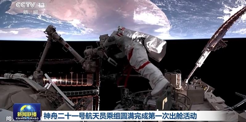 Phi hành đoàn Thần Châu 21 tiến hành lắp đặt thiết bị bảo vệ trạm vũ trụ. Ảnh: CCTV