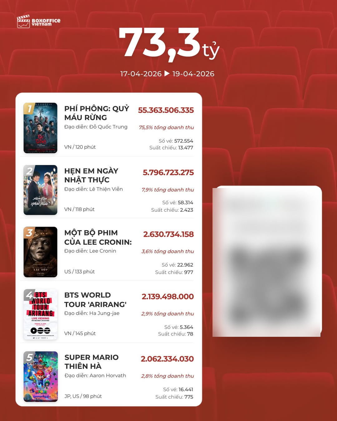 Tiếp theo là "BTS world tour Arirang" đạt doanh thu hơn 2,13 tỷ đồng (chiếm 2,9%). Khép lại vị trí Top 5 phòng vé dịp cuối tuần là "Super Mario thiên hà" với doanh thu khoảng 2,06 tỷ đồng, chiếm 2,8% tổng doanh thu phòng vé.