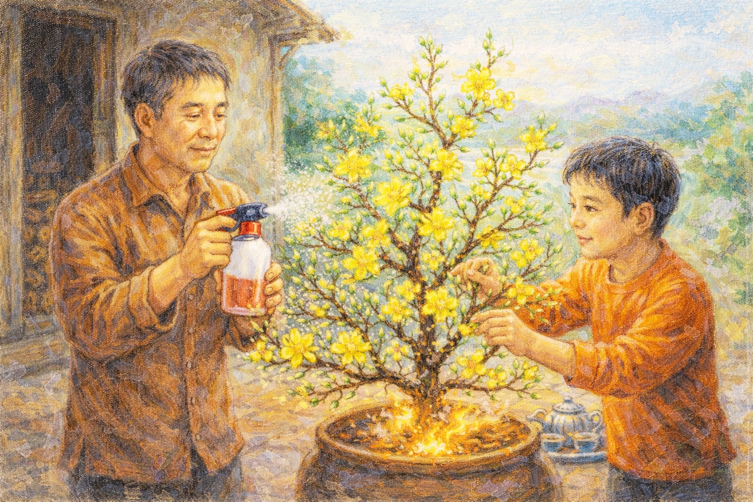 Sau khi cành mai được thui gốc và cắm vào chiếc ché sành đựng đầy nước mưa, cả nhà tôi bước vào một giai đoạn chăm sóc mà ba gọi là “chăm con mọn”. Từ lúc này cho đến tết, mỗi ngày đi làm về, việc đầu tiên của ba là tưới nước. Không phải tưới ào ào cho xong chuyện, mà dùng cái bình xịt nhỏ phun từng tia nước li ti như sương sớm lên khắp các kẽ lá, nách cành. Ba quan sát từng chuyển động nhỏ nhất của cành mai. Nếu thấy đầu nụ hơi thâm, ông sẽ lo lắng đến mất ăn mất ngủ. Nếu thấy vỏ lụa bắt đầu nứt, ông lại cười khà khà chế bình trà làm một ngụm. Nhưng cái khó nhất là kỹ thuật điều khiển thời gian. Có năm gió bấc về muộn, trời hầm hập, mai có nguy cơ bung nở ngay từ rằm tháng chạp. Gương mặt ba lo lắng thấy rõ. Ông chạy tới chạy lui, hỏi han mấy cụ già trong xóm về chiêu “kiềm” mai. Nào là đắp đá lạnh quanh gốc, dùng vải bao bố che chắn nắng. Ngược lại, có những năm trời lạnh tái tê, mai nằm im lìm “nín thở”, không chịu bung vỏ lụa. Ba lại lăng xăng đốt đống củi dưới gốc, rồi pha nước ấm tưới vào gốc, hi vọng hơi ấm sẽ đánh thức giấc ngủ của loài hoa núi rừng.