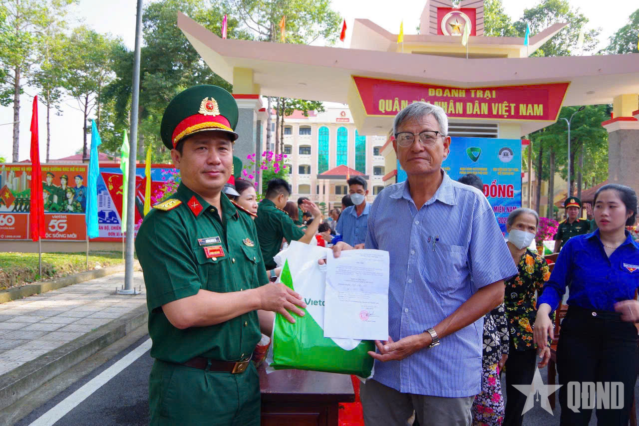 Cán bộ Trung đoàn 271 trao quà tặng bà con.
