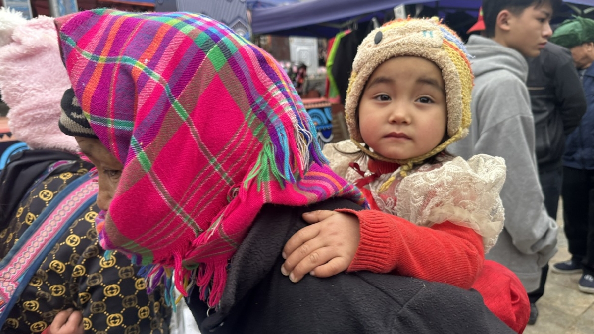 Một em bé được mẹ cõng trên lưng đi chợ Tết.