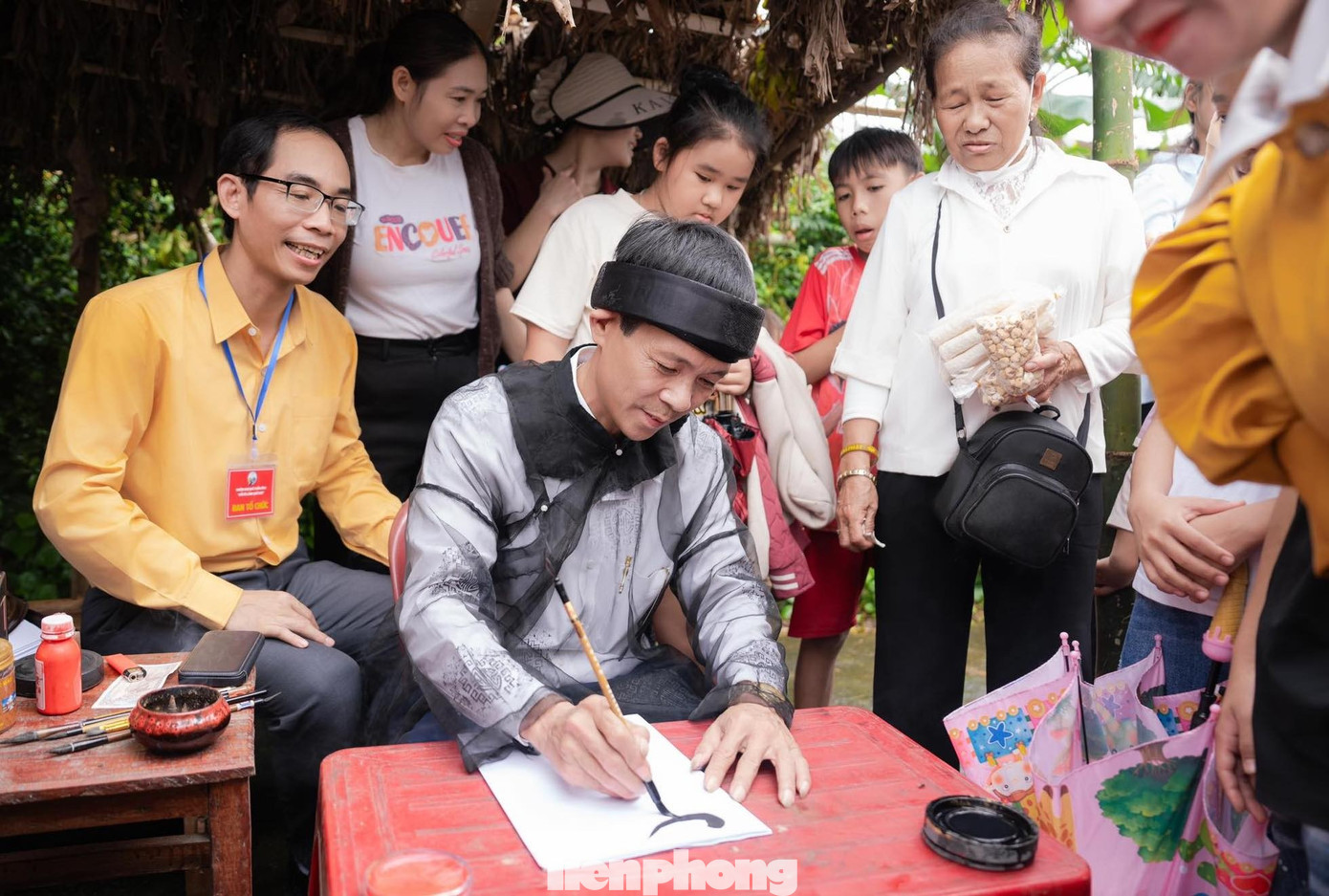 Ông Đồ ngồi cho chữ giữa phiên chợ quê thu hút sự quan tâm của nhiều người.