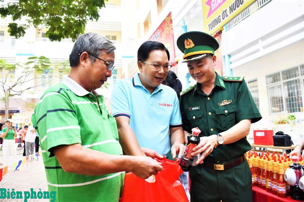 Lãnh đạo phường Rạch Dừa, thành phố Hồ Chí Minh và Ban Chỉ huy Biên phòng cửa khẩu cảng Bà Rịa - Vũng Tàu, Bộ đội Biên phòng thành phố Hồ Chí Minh trao tặng quà cho người dân trên địa bàn tại "Gian hàng 0 đồng". Ảnh: Quang Anh