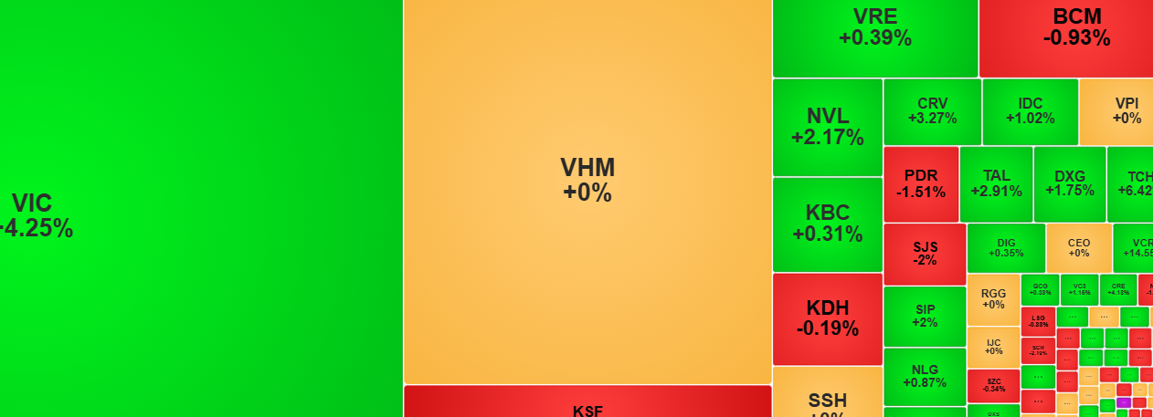 Với mức tăng 4,25%, VIC – mã có vốn hóa lớn nhất – đóng góp nhiều nhất vào VN-Index với 9,39 điểm. Nhóm cổ phiếu ngân hàng cũng hỗ trợ tích cực cho thị trường khi HDB, TCB, STB, CTG, VPB, MBB đóng góp từ 0,27 đến 1,23 điểm. Các mã như GEE, MWG, VPX… cũng đóng góp tích cực vào đà tăng của thị trường.