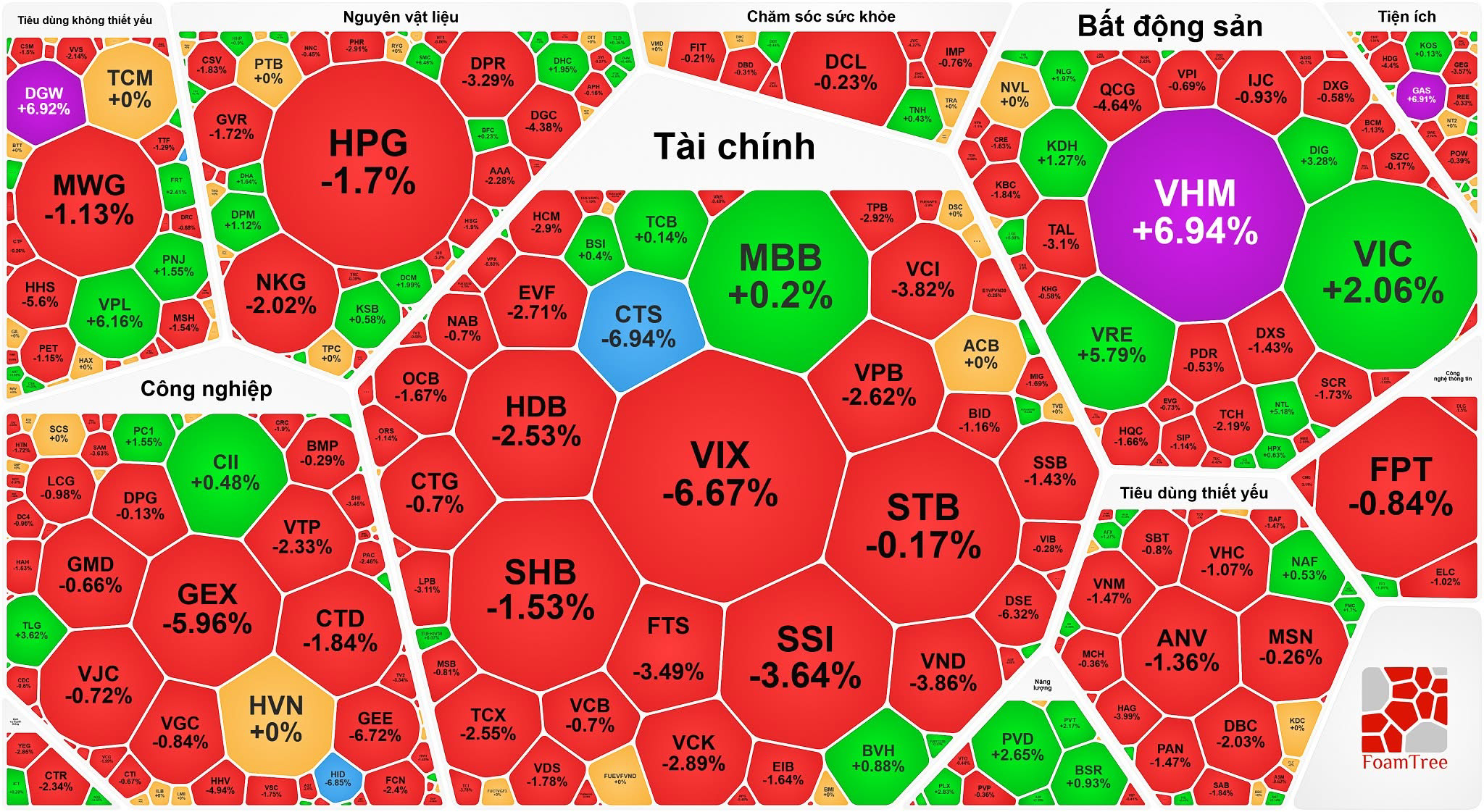 Các nhóm cổ phiếu còn lại như tài chính (chứng khoán, ngân hàng), nguyên vật liệu, công nghiệp, tiêu dùng.... đồng loạt giảm. Trong đó, nhiều cổ phiếu chứng khoán giảm trên 3%: CTS giảm sàn, VIX giảm 6,67%, SHS giảm 5,83%, VND giảm 3,86%, VCI giảm 3,82%, SSI giảm 3,64%, MBS giảm 3,46%...