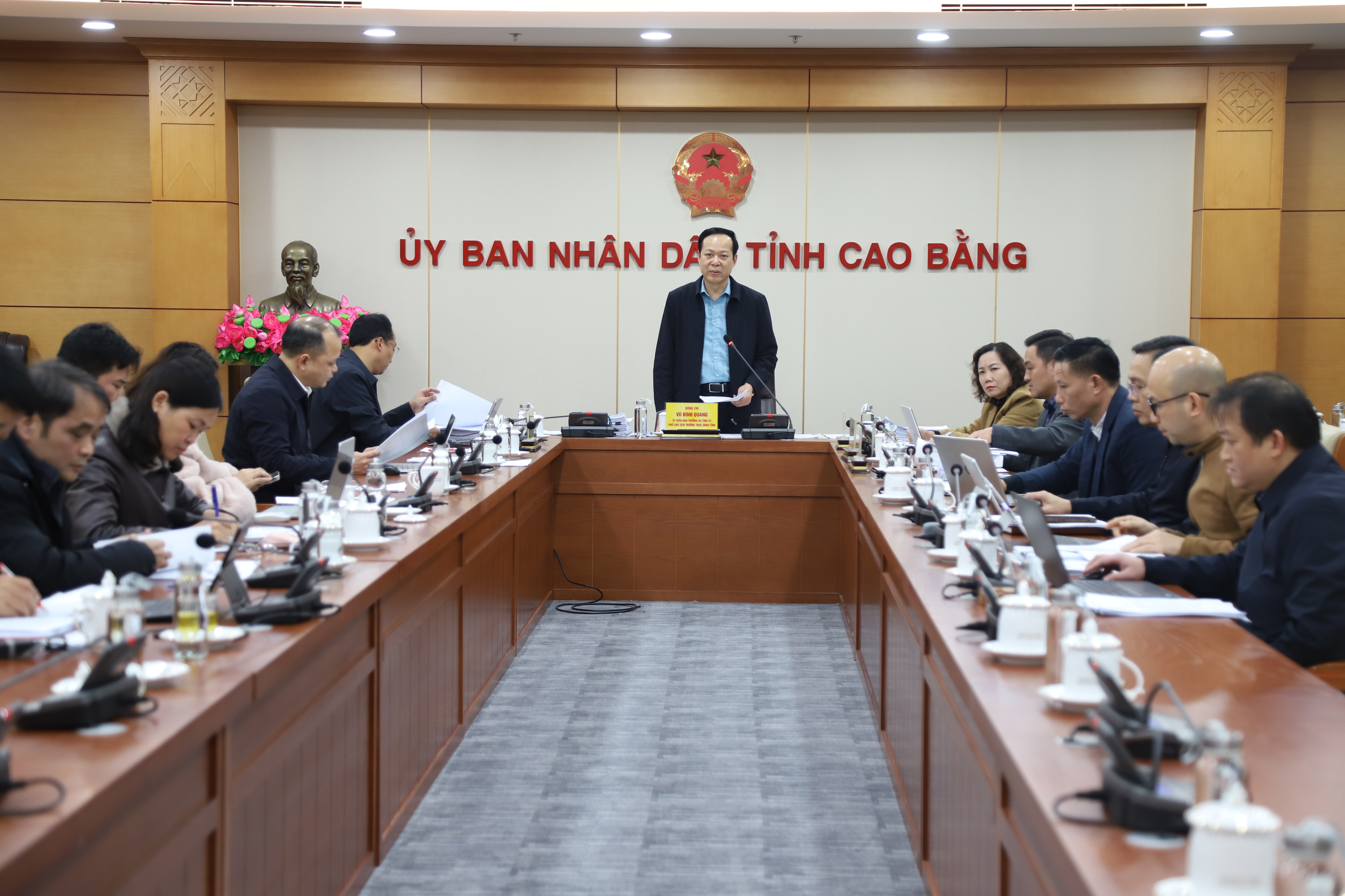 Xem xét, thông qua 11 dự thảo văn bản quy phạm pháp luật do các sở, ngành soạn thảo, gồm: Nghị quyết Quy định mức thu, chế độ thu, nộp, quản lý và sử dụng Phí sử dụng công trình kết cấu hạ tầng, công trình dịch vụ, tiện ích công cộng trong khu vực cửa khẩu trên địa bàn tỉnh; Quyết định quy định đặc điểm kinh tế - kỹ thuật của dịch vụ thu gom, vận chuyển, xử lý chất thải rắn sinh hoạt trên địa bàn tỉnh; Quy định định mức kinh tế - kỹ thuật đối với một số loại cây trồng, vật nuôi, thủy sản thuộc lĩnh vực nông nghiệp trên địa bàn tỉnh; Quyết định ban hành Quy định về quản lý an toàn trong sử dụng điện trên địa bàn tỉnh; Quyết định phân cấp thực hiện một số nhiệm vụ, quyền hạn trong lĩnh vực thương mại thuộc thẩm quyền của UBND tỉnh; Quyết định ban hành Quy định một số nội dung về phát triển và quản lý chợ trên địa bàn tỉnh; Quyết định quy định tiêu chuẩn, định mức xe ô tô chuyên dùng trong lĩnh vực y tế của các cơ quan, đơn vị sự nghiệp y tế công lập thuộc phạm vi quản lý trên địa bàn tỉnh; Quyết định sửa đổi, bổ sung một số Quyết định UBND tỉnh ban hành thuộc lĩnh vực Tư pháp; Quyết định ban hành Quy chế phối hợp trong công tác tổ chức thi hành văn bản quy phạm pháp luật trên địa bàn tỉnh; Quyết định ban hành Quy chế quản lý, vận hành và sử dụng Nền tảng Công dân số Cao Bằng; Quyết định ban hành Quy định thực hiện nếp sống văn minh trong việc cưới, việc tang trên địa bàn tỉnh.