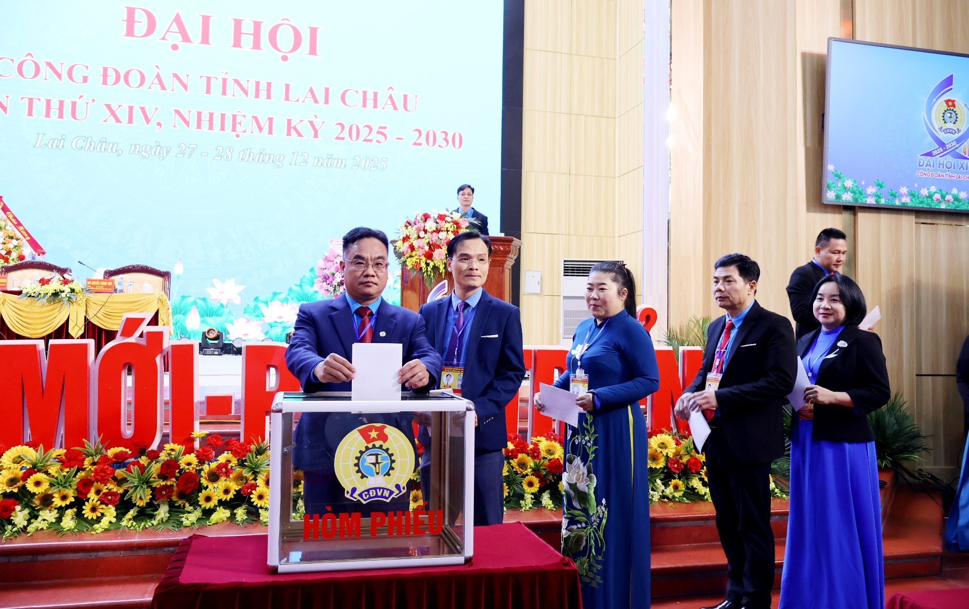 Đoàn Chủ tịch Đại hội bỏ phiếu bầu Ban Chấp hành Liên đoàn Lao động tỉnh Lai Châu khóa XIV, nhiệm kỳ 2025-2030.