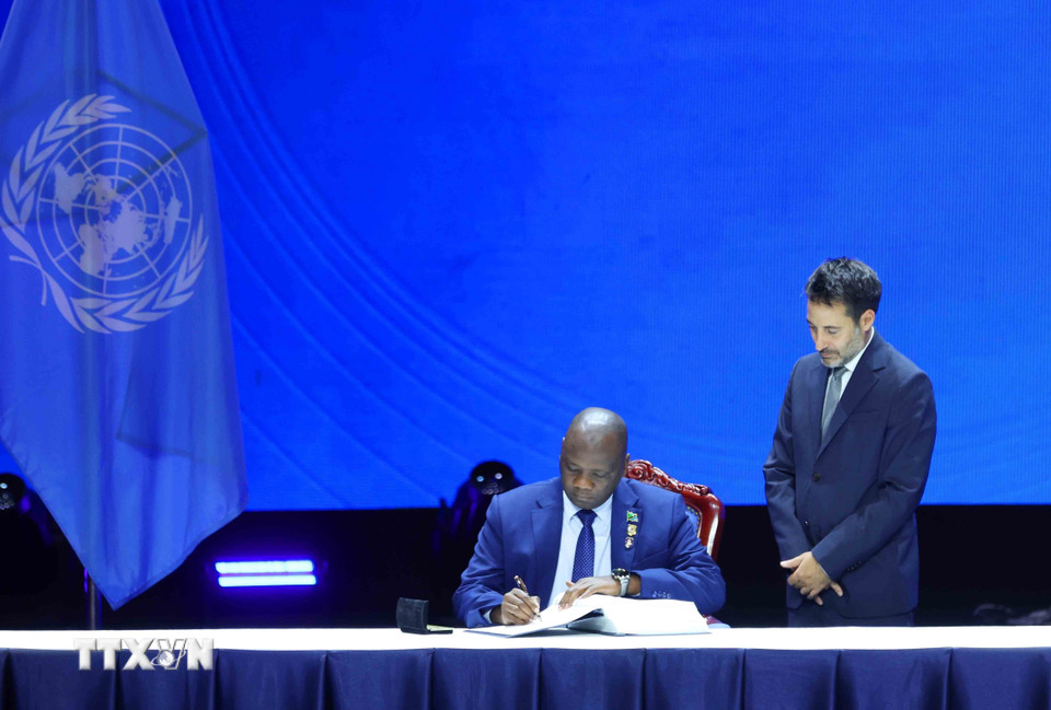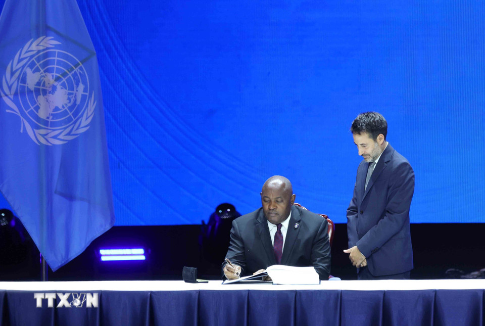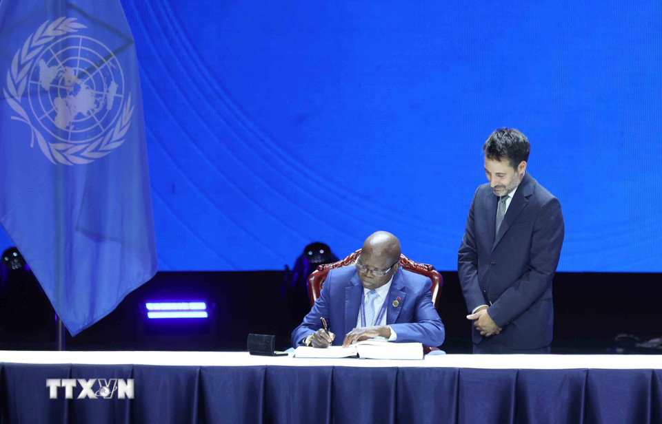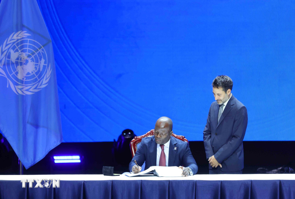 Đại diện Cộng hòa Angola ký Công ước của Liên hợp quốc về chống tội phạm mạng. (Ảnh: Phương Hoa/TTXVN)