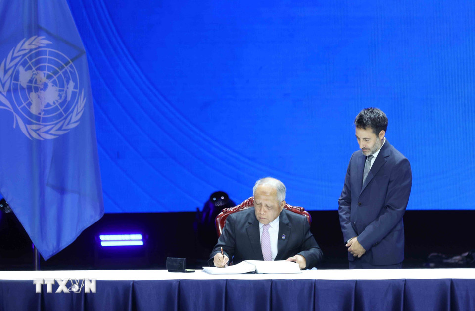 Đại diện Vương quốc Brunei Darussalam ký Công ước của Liên hợp quốc về chống tội phạm mạng. (Ảnh: Phương Hoa/TTXVN)