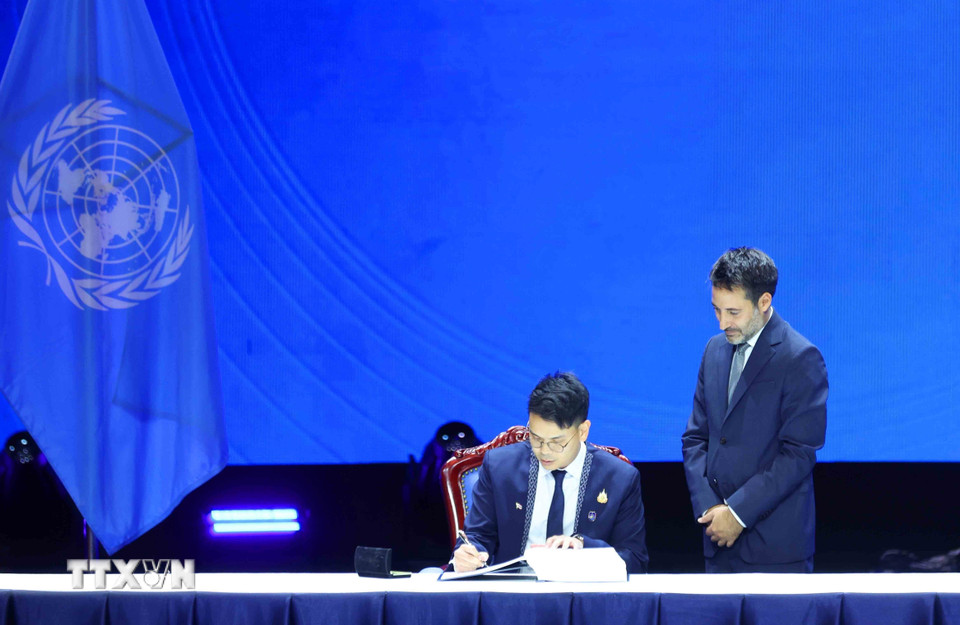 Bộ trưởng Kinh tế và Xã hội Kỹ thuật số, Vương quốc Thái Lan Prasert Chandraruangthong ký Công ước của Liên hợp quốc về Chống tội phạm mạng. (Ảnh: Phương Hoa/TTXVN)