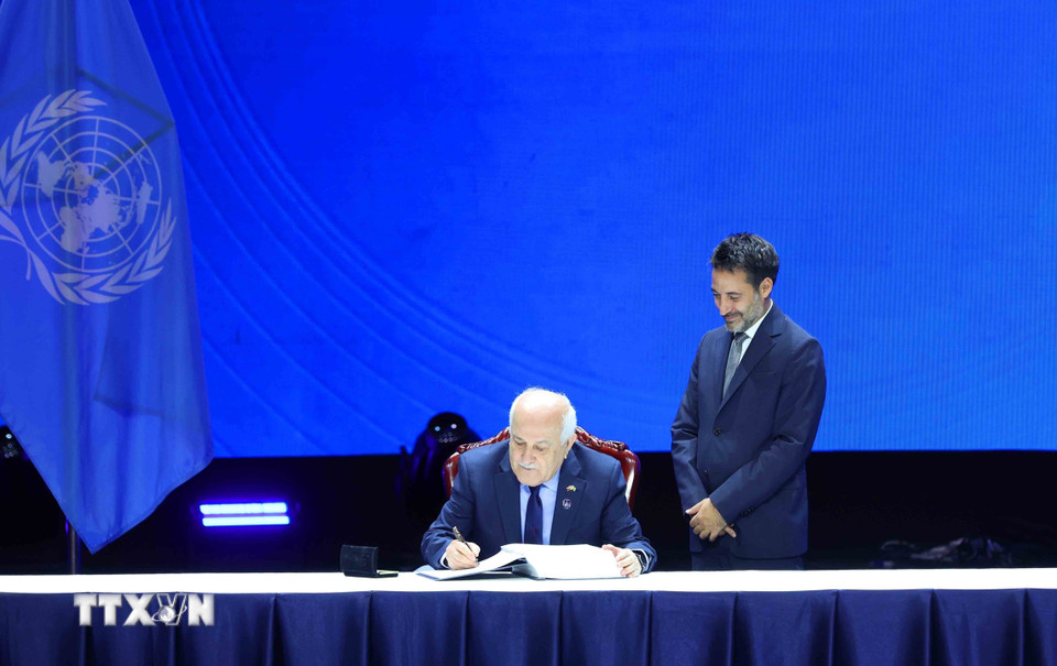 Bộ trưởng kiêm Đại diện thường trực của Nhà nước Palestine tại Liên Hợp Quốc Ibrahim Khraishi ký Công ước của Liên hợp quốc về Chống tội phạm mạng. (Ảnh: Phương Hoa/TTXVN)