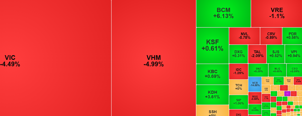 Bất động sản và tín dụng là hai nhóm ngành giảm điểm mạnh nhất trong phiên, lần lượt mất 3,16% và 2,17%, qua đó tác động lớn nhất đến đà đi xuống của thị trường. Trong đó, VIC giảm 4,49%, lấy đi tới 11,61 điểm của VN-Index, còn VHM kéo chỉ số giảm 5,38 điểm.