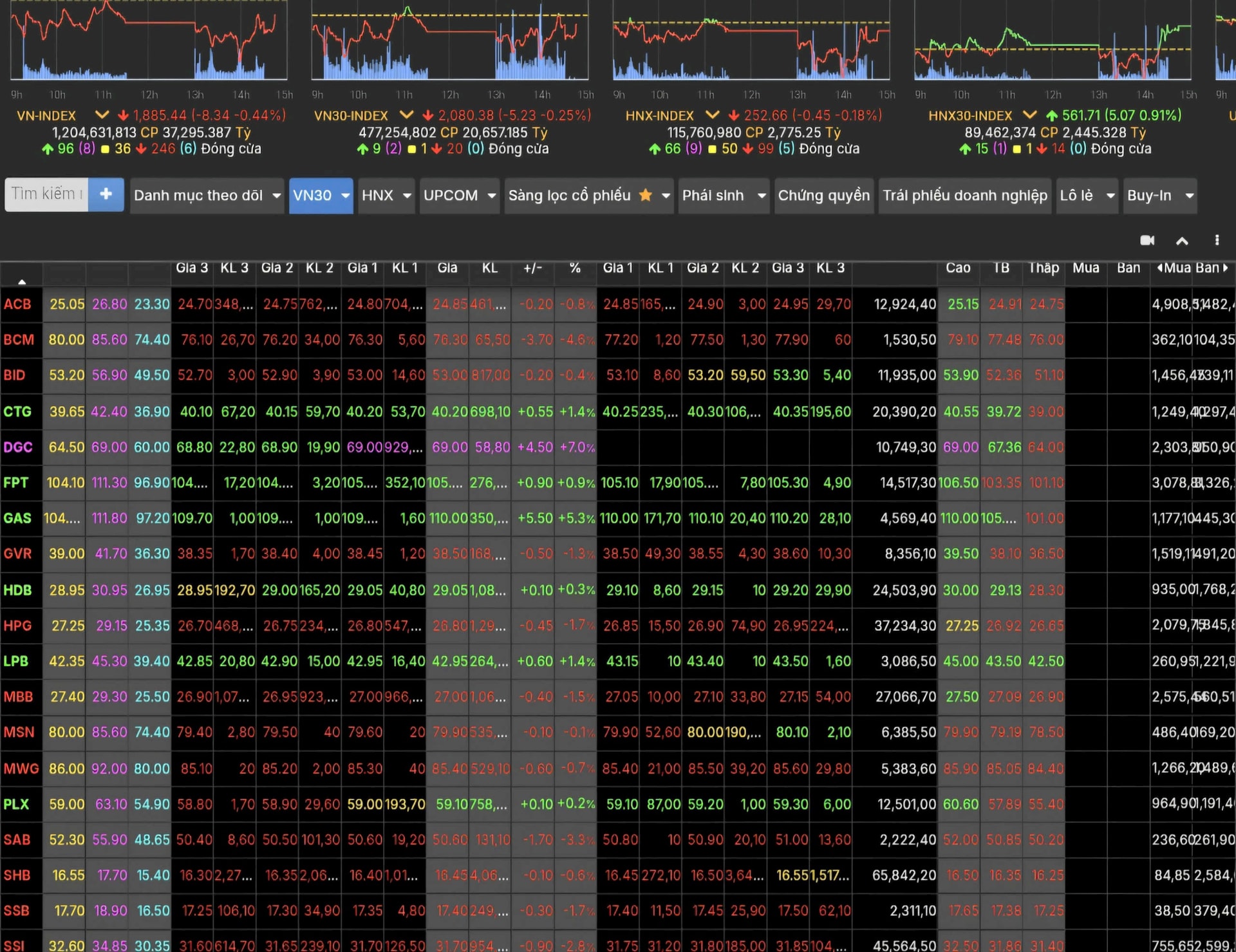 Sắc đỏ chiếm áp đảo với 246 mã giảm giá, 96 mã tăng giá. Tại rổ VN30, số mã tăng-giảm giá lần lượt là 9 mã và 20 mã.