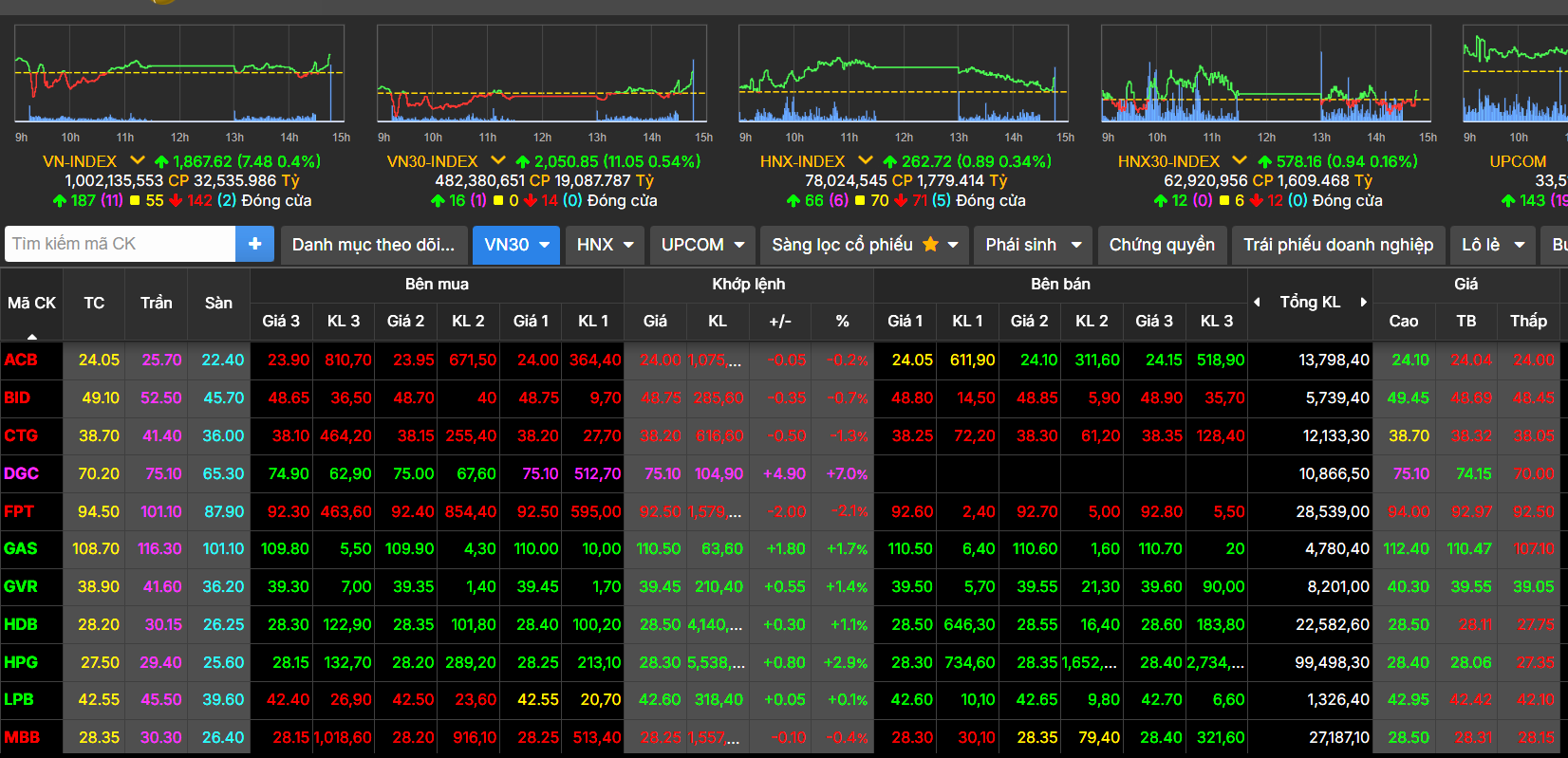 Chốt phiên, VN-Index đạt 1.867,62 điểm, tăng 7,48 điểm (0,4%); VN30-Index tăng 11,05 điểm (0,54%), lên 2.050,85 điểm.