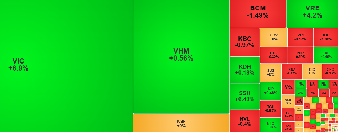Động lực chính đến từ VIC – cổ phiếu có vốn hóa lớn nhất thị trường. Mã này tăng 6,9%, đóng góp tới 18,93 điểm cho VN-Index. Bên cạnh đó, các mã GEE, BSR, TCB, VRE, LPB, VCB, VHM, FPT, TCX cũng góp phần củng cố đà tăng.