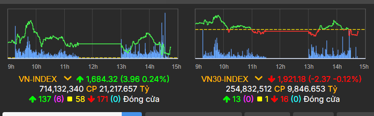 Đóng cửa VN-Index dừng ở mức 1.684,32 điểm, tăng 3,96 điểm (0,24%) trong khi VN30-Index còn 1.921,18 điểm, hạ 2,37 điểm (-0,12%).